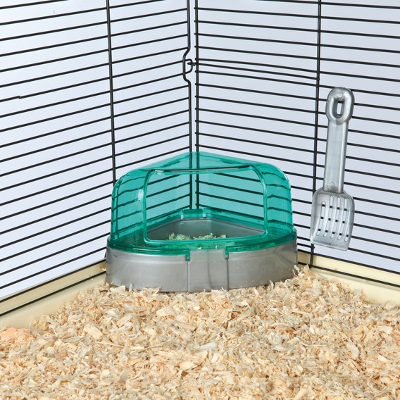 Kulmavessan käyttäminen helpottaa häkin puhtaanapitoa.