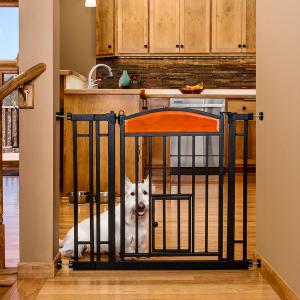 Portti on tukevaa ja kestävää metallia, kahvassa on lapsilukko. Alareunassa pieni kissanluukku. Korkeus 76 cm. Leveyden voi säätää sopivaksi 74-96 cm leveisiin oviaukkoihin.