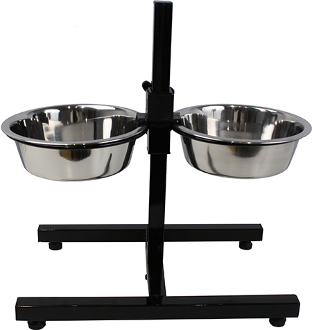 Ruostumattomasta teräksestä valmistettu koiran korotettu ruokakuppisetti. Sisältää 2kpl ruokakuppeja, molemmin puolin. Kuppien koko 19cm / 1700ml. Korkeus säädettävissä 11 - 40cm.